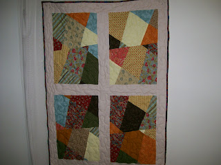 The first QAYG quilt was finished today and it is going to a group which helps homeless people in Melbourne. They have a special day where they provide support and information about the community services which are available for them. This is warm and was made from all the leftover trimmings from backings as well as poly cottons and flannels. It's in darker colours so it won't show the dirt and will be more suited to a man but it will be warm regardless of fabric colour.